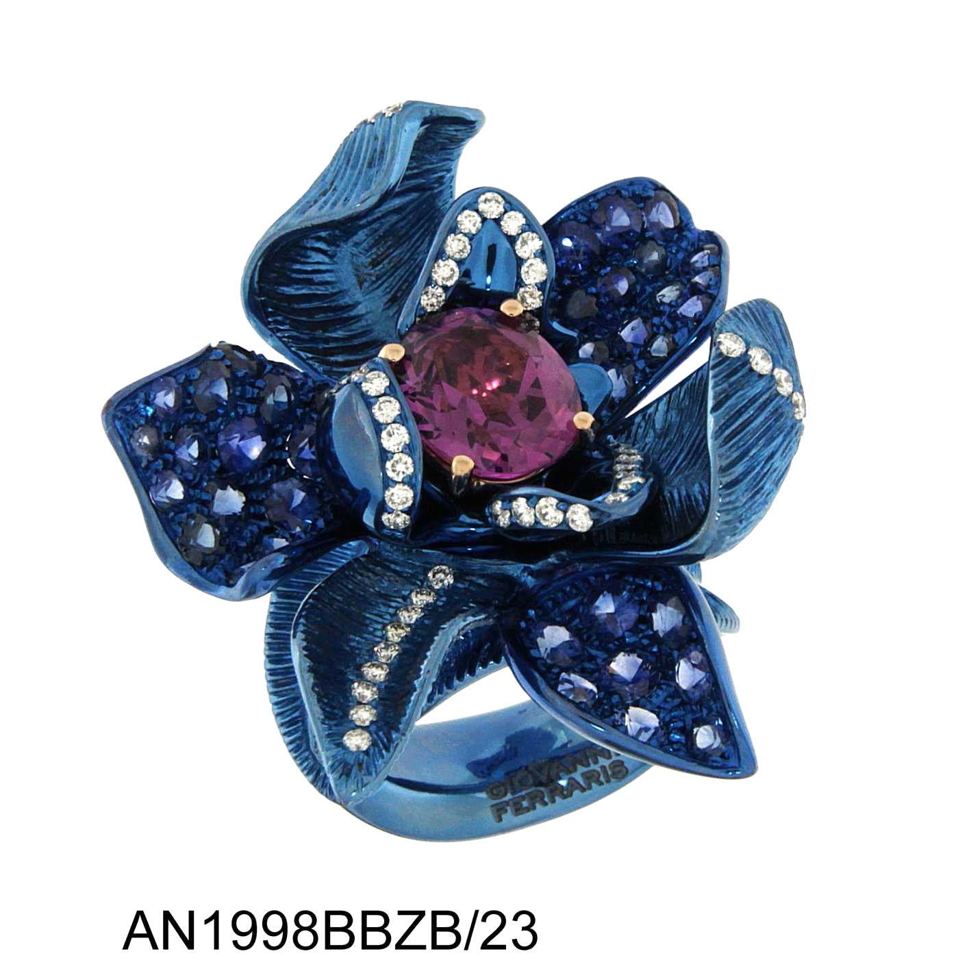 RING, BLUE ANODIZED TITANIUM, DIAMONDS, BLUE SAPPHIRES, PINK TOURMALIN