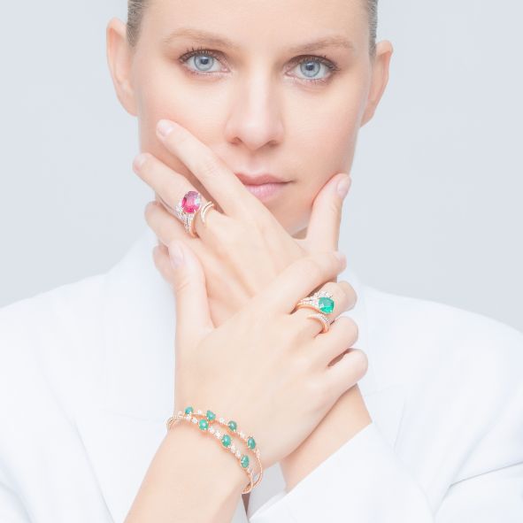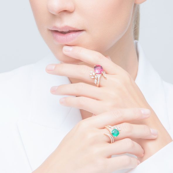 ANELLO ORO ROSA, DIAMANTI, SMERALDO